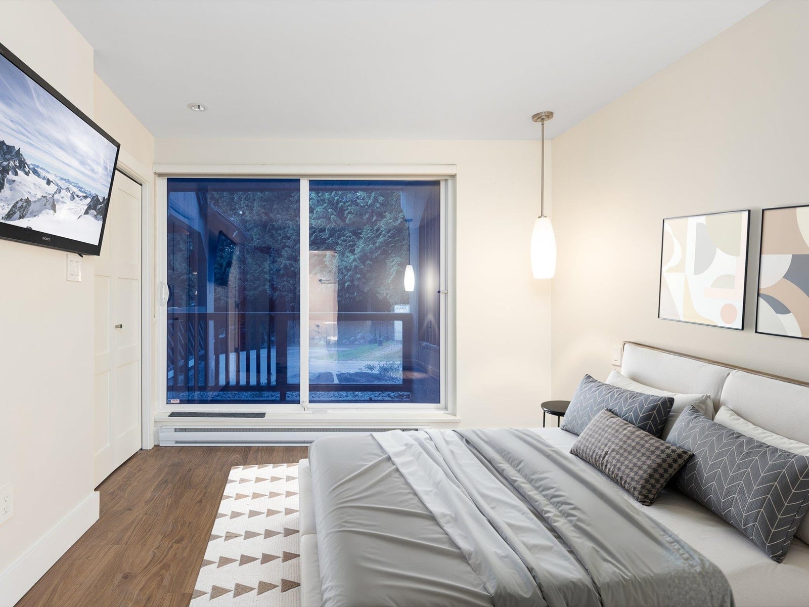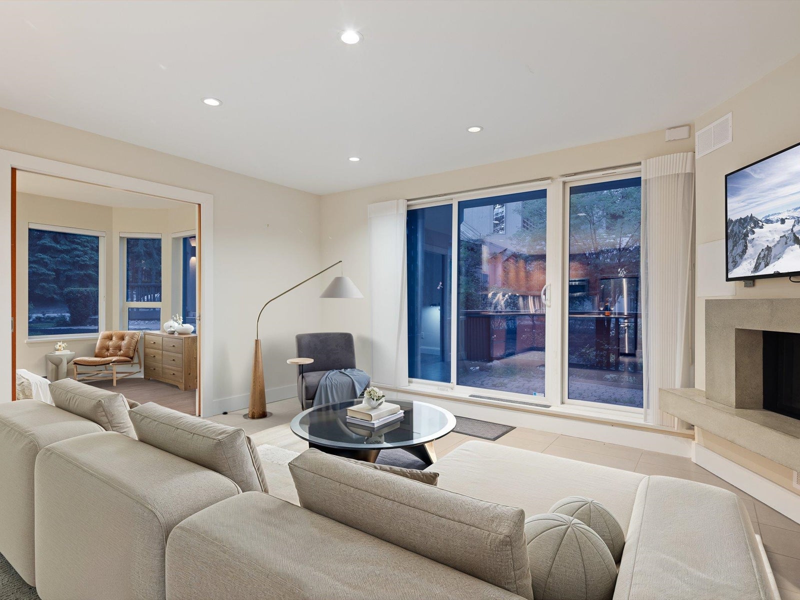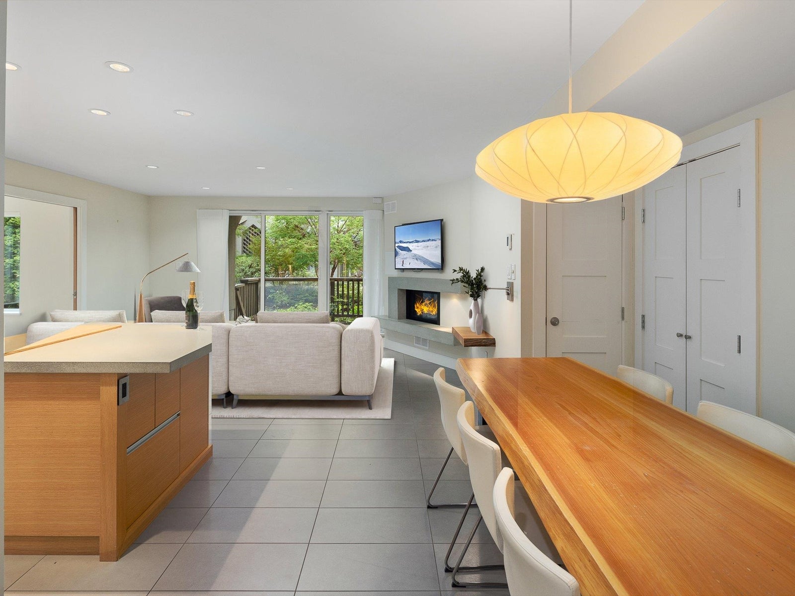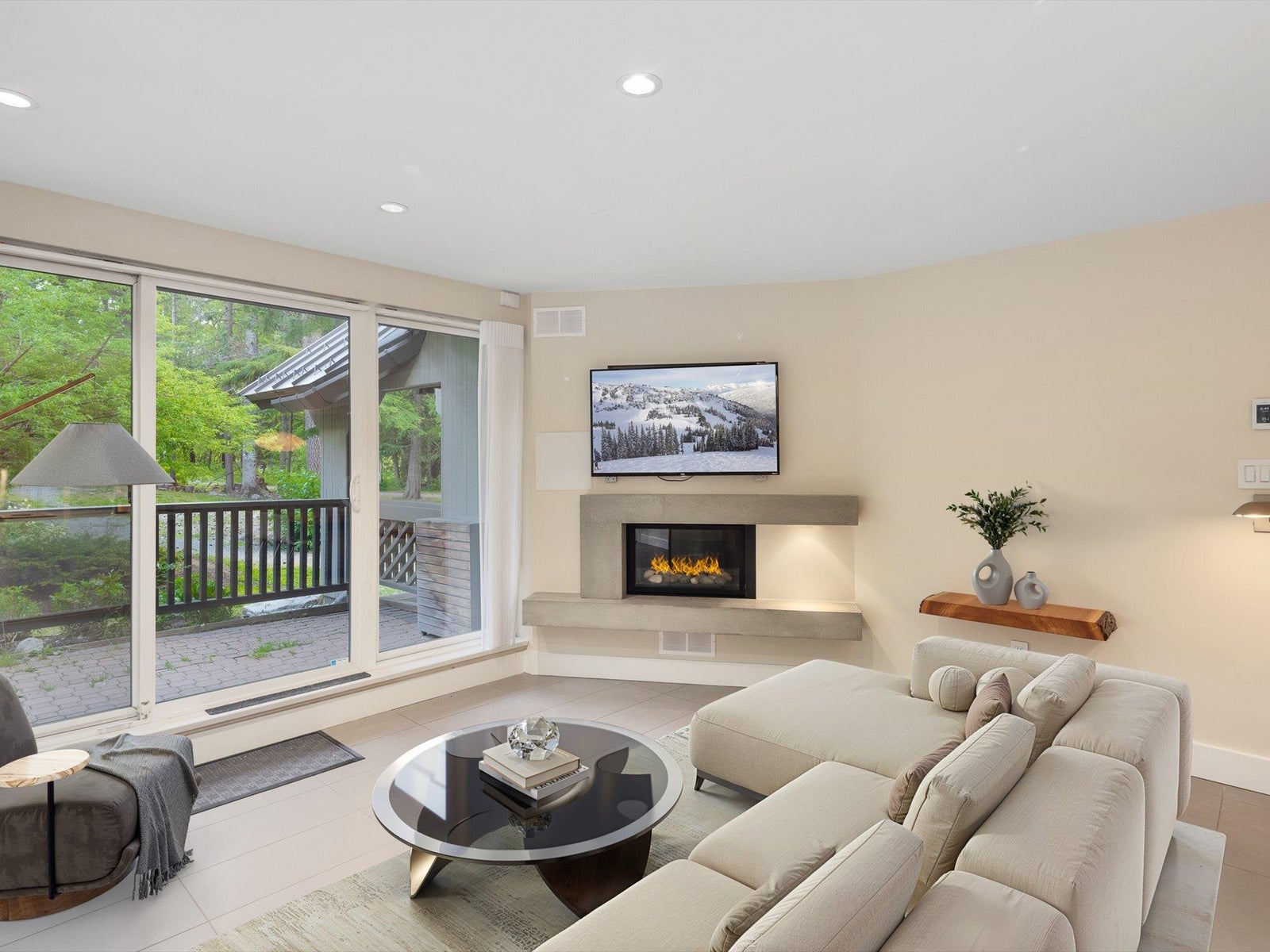 Ideally positioned between the base of Blackcomb and Whistler Village gondolas, The Gables offers one of Whistler’s most coveted locations. This modern 2-bedroom, 2-bathroom townhome is thoughtfully designed on one spacious level, nestled among mature trees near the Fitzsimmons Creek trail. The sleek kitchen showcases stainless steel finishes and custom concrete countertops, complemented by a striking concrete fireplace, electronic blinds, and WiFi thermostat. Heated floors in the entry and bathrooms add warmth, while bedroom separation ensures privacy. Zoned for unlimited owner use and nightly rentals, this home suits those seeking a private mountain escape with excellent income potential.